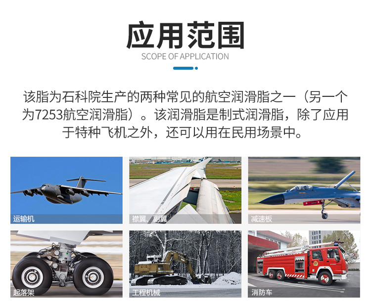 該脂為石科院生產(chǎn)的兩種常見的航空潤滑脂之一(另一個為7253航空潤滑脂)。該潤滑脂是部隊(duì)制式潤滑脂,除了應(yīng)用于飛機(jī)之外,還可以用在民用場景中。