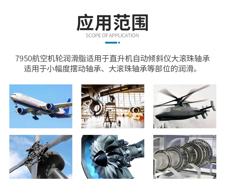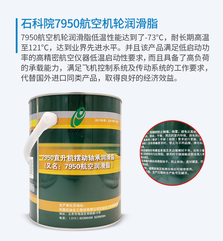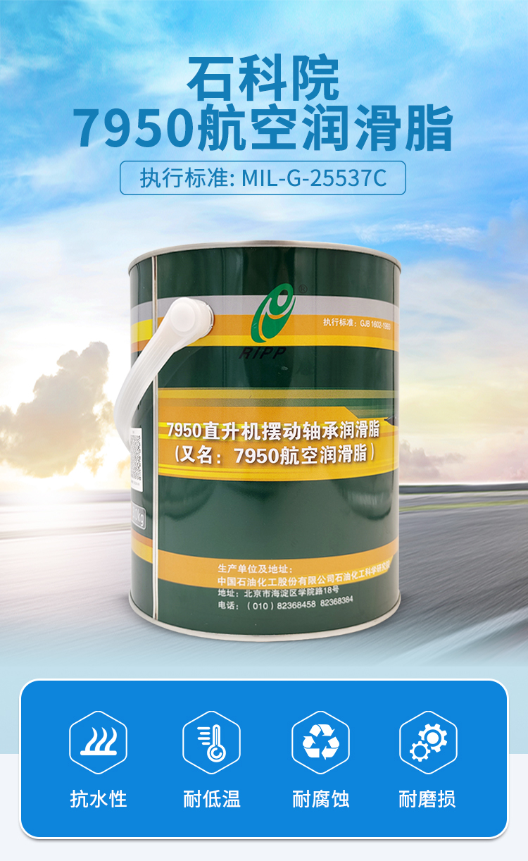 7950航空機輪潤滑脂是我國軍方及國產飛機廣泛使用的潤滑產品。取代了80年代以前使用的7008、7008-1及7012航空潤滑脂,其低溫性能達到了極低溫至-73℃,耐長期高溫至121℃,達到業界先進水平。并且該產品優良的低溫啟動轉矩及運轉轉矩,滿足低啟動功率的高精密航空儀器低溫啟動性要求,而且具備了高負荷的承載能力,滿足飛機控制系統及傳動系統的工作要求,代替國外進口同類產品,取得良好的經濟效益。