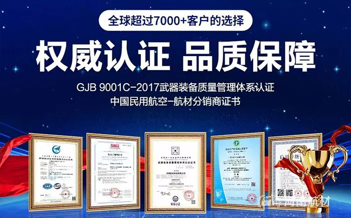 持有GJB 9001C-2017武器裝備質量管理體系認證;ISO 9001質量管理體系認證;民航航材分銷商認證;職業健康安全體系認證;環境管理體系認證;企業信用認證。